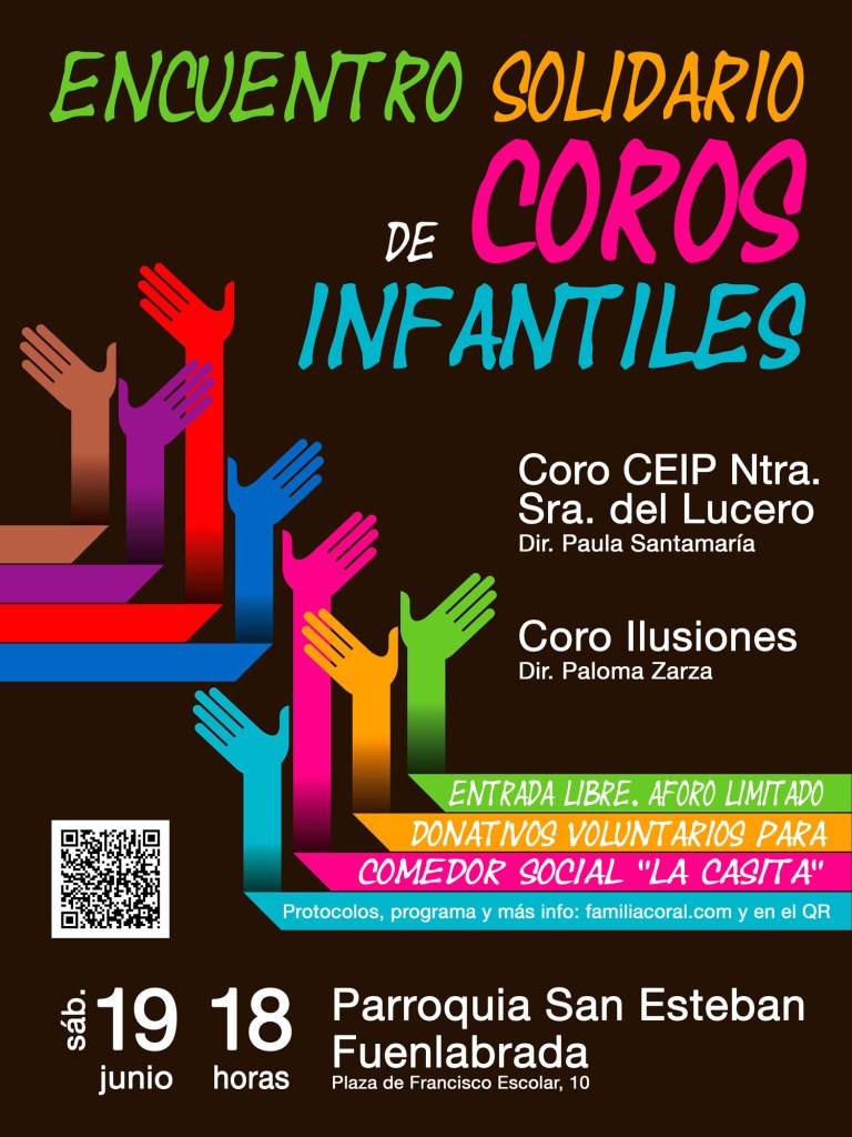 El próximo 19 de junio, sábado, a las 18:00 horas, tendrá lugar el Encuentro solidario de coros infantiles, que se celebrará en la iglesia San Esteban Promomártir (Plaza de Francisco Escolar,10, Fuenlabrada), con la participación del Coro Ilusiones (de Griñón) y del Coro del CEIP Ntra. Sra. del Lucero (de Madrid).