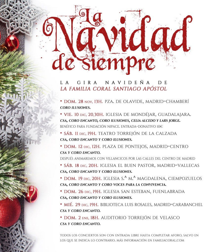 - Vie. 10 dic, 20,30h. Iglesia de Mondéjar, Guadalajara. CSA, Coro Encanto, Coro Ilusiones, Celia Alcedo y Lars Jorge. Benéfico para Fundación Nipace (niños con parálisis cerebral). Entrada-donativo: 10€