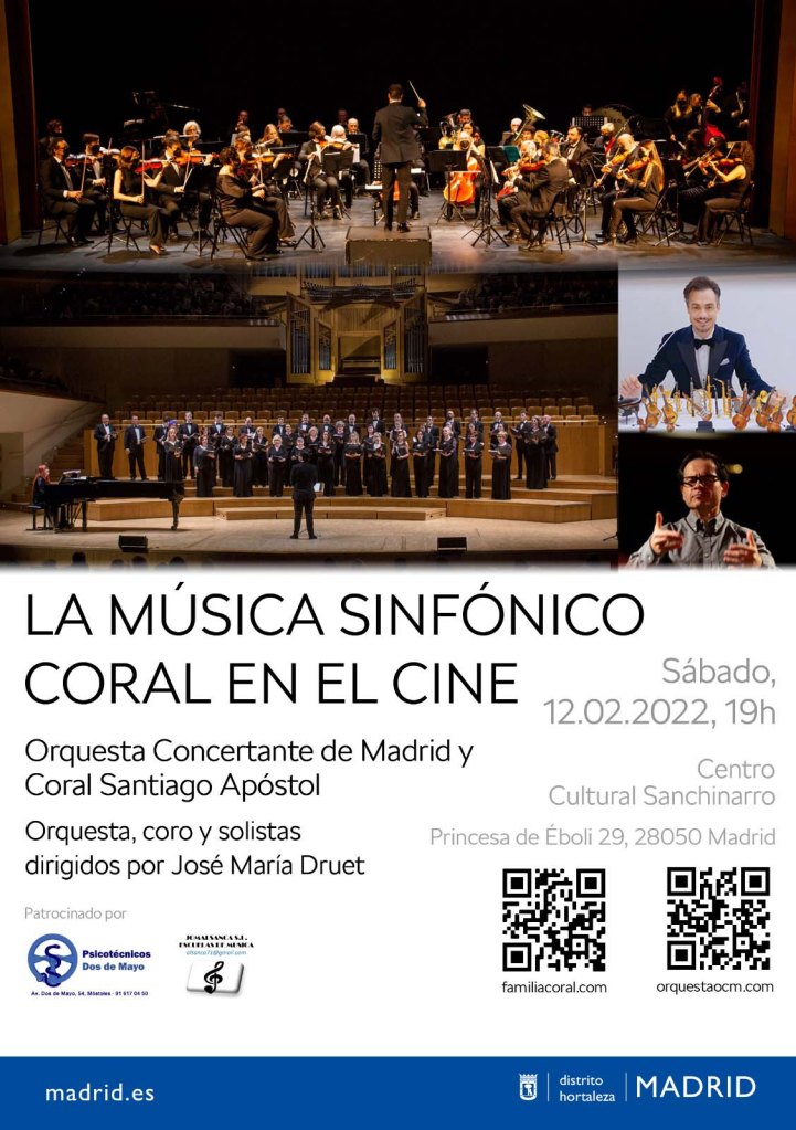 El próximo sábado 12 de febrero la Coral Santiago Apóstol se une a la Orquesta Concertante de Madrid para interpretar un concierto temático basado en las grandes bandas sonoras del cine interpretando una nutrida selección de conocidos temas de películas y series de televisión, así como musicales, música de videojuegos y conocidos temas pop cinematográficos bajo el denominador común del uso del coro y de cantantes solistas acompañados por orquesta sinfónica, que harán las delicias de los amantes del cine, los musicales, los videojuegos el pop sinfónico y la televisión. La orquesta, coro y solistas, estarán dirigidos por el Maestro titular de la Orquesta José María Druet. El coro ha sido preparado por el director de la CSA, Mariano García