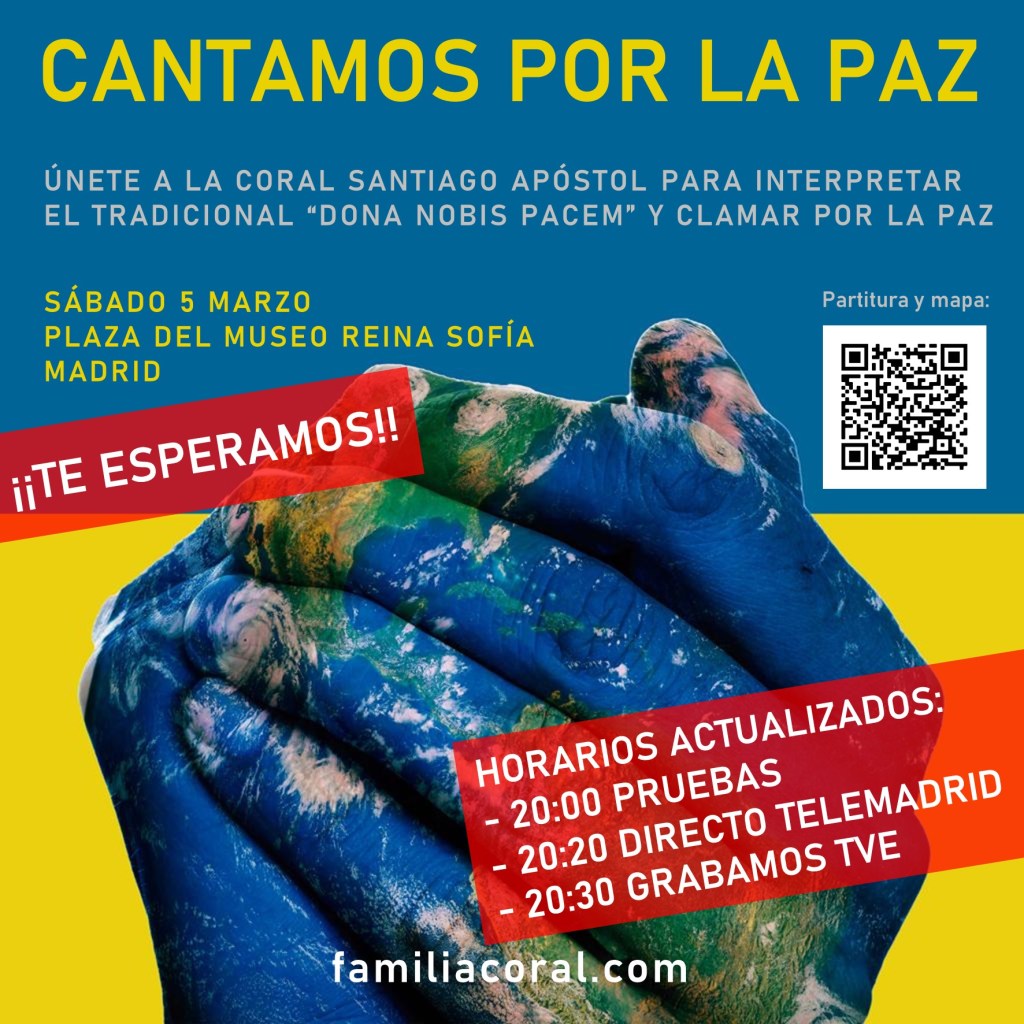 El sábado 5 por la tarde, la Coral Santiago Apóstol elevó sus voces por la paz en Europa y en todo el mundo, junto a varios cientos de coralistas madrileños y público en general que se unió a nosotros. Fue un acto sencillo, espontáneo y sin connotaciones políticas ni consignas ideológicas. Con él pretendemos que la música nos haga a todos (ciudadanos, colectivos y gobiernos) más sensibles para promover la paz.