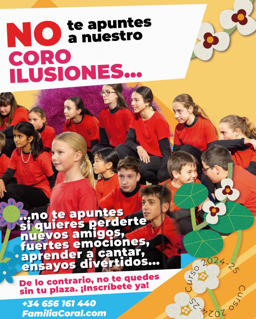 Con nosotros, cada ensayo es una aventura y cada canción, una experiencia inolvidable. No te quedes sin tu plaza para el curso 2024-25. Inscríbete ahora y únete a la magia de cantar juntos. Tenemos tres coros: infantil, juvenil y adulto. No necesitas experiencia ni conocimientos musicales previos; sólo gusto por cantar, buen oído musical, ganas de hacer amigos y compromiso con un apasionante proyecto musical en equipo.
