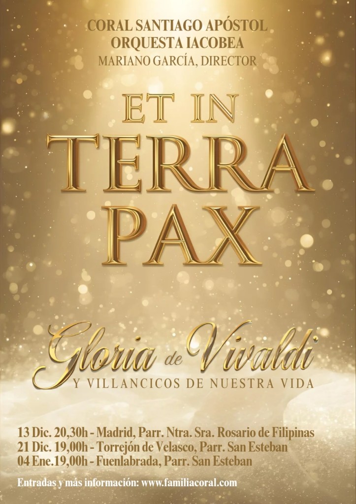 La Coral Santiago Apóstol y la Orquesta Iacobea, bajo la dirección de Mariano García, presentan “Et in terra pax”, un programa que une el Gloria de Antonio Vivaldi con una selección de villancicos de siempre en una sorprendente versión sinfónica. Tras los últimos tres meses de intenso trabajo —y tras el lleno absoluto en el concierto en la Catedral de La Almudena—, os presentamos estos conciertos con enorme ilusión, deseando que disfrutéis con nosotros.